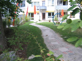 in die Spielflächen geholt. Im zweiten Schritt wurden zwei neue Sandspielflächen, die auch zum Spielen mit Wasser genutzt werden können, integriert. Umrahmt wird die Grünfläche von einem neuen, aus verschiedenen Materialen bestehenden, Pflasterweg, der als „Rennstrecke“ für Kinder-fahrzeuge dient. Eine kleine Hügellandschaft mit Rutsche fordert zum Toben auf. Für ruhigeres Spielen wurde ein Heckengarten geschaffen, zum Verstecken lädt ein neu entstandenes Strauch-dickicht ein. Darüber hinaus wurden für Sinneswahrnehmungen der geschmack-lichen Art an zahl- reichen Stellen der Grünfläche Kräuter und Obst- gehölze gepflanzt.