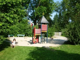 Zentrum der Grünanlage ist der große Spielplatz, der das ganze Jahr über beliebter Treffpunkt der Kinder aus der unmittelbar angrenzen- den Neubausiedlung ist. Der multifunktionale Spielturm mit Rutsche und die seitlich des Sandbereichs stehenden Spielhäuser inmitten weitläufiger Strauch-pflanzungen laden zum Spielen und geselligen Aufenthalt ein.
